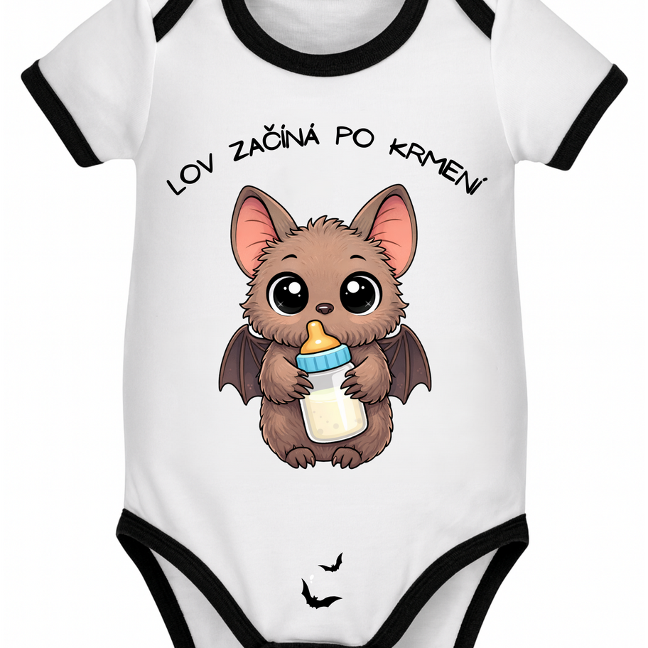 Roztomilé dětské body s malým netopýrkem, který si spokojeně drží lahvičku, a nápisem „Lov začíná po krmení“ dokonale vystihuje každodenní realitu miminek – i jejich rodičů.