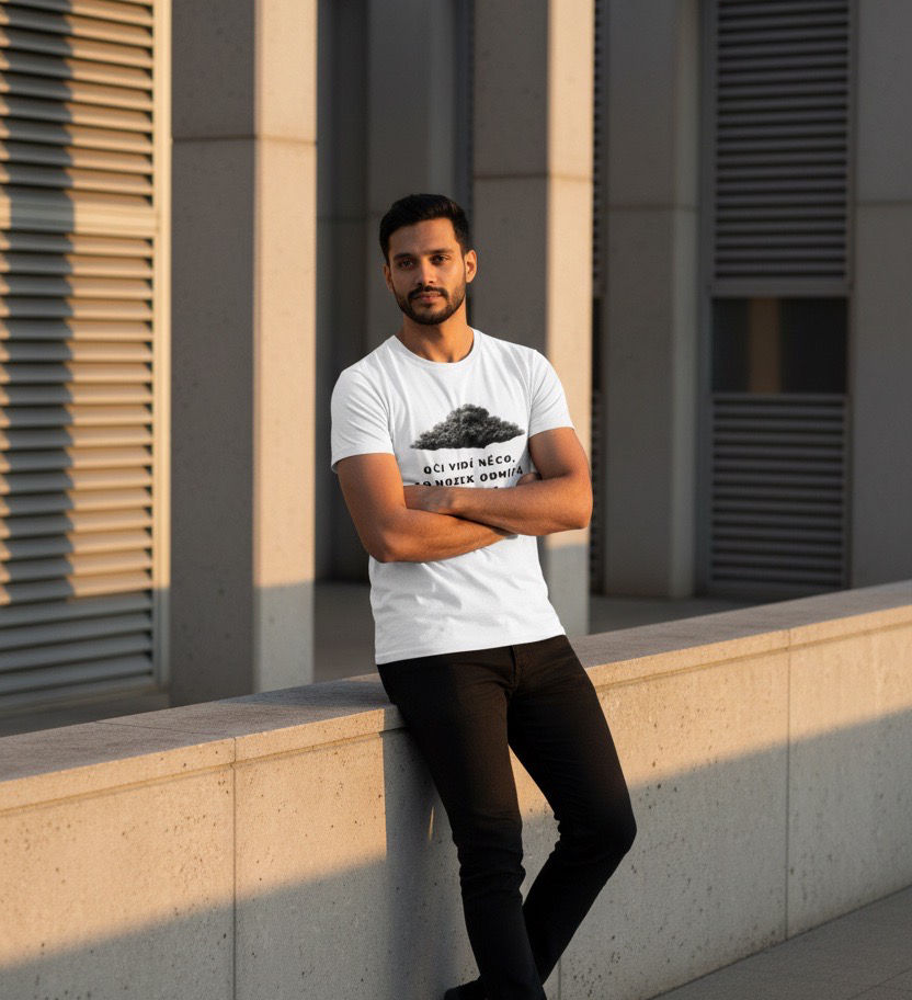 Minimalistické pánské tričko inspirované postapokalyptickým románem A pak se zřítilo nebe. Výrazný motiv temného mraku a věta, která vystihuje okamžik, kdy realita předběhne lidské chápání.