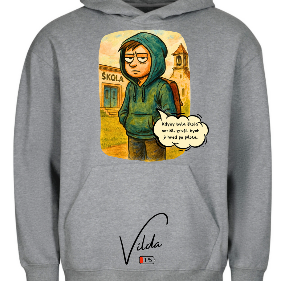 Ideální mikina pro všechny, kdo ví, že pondělí by mělo být volitelné, testy zakázané a školní docházka výrazně zkrácená. Podpis Vilda a ikonka vybité baterie (1 %) dávají jasně najevo, kolik energie tenhle den ještě má.