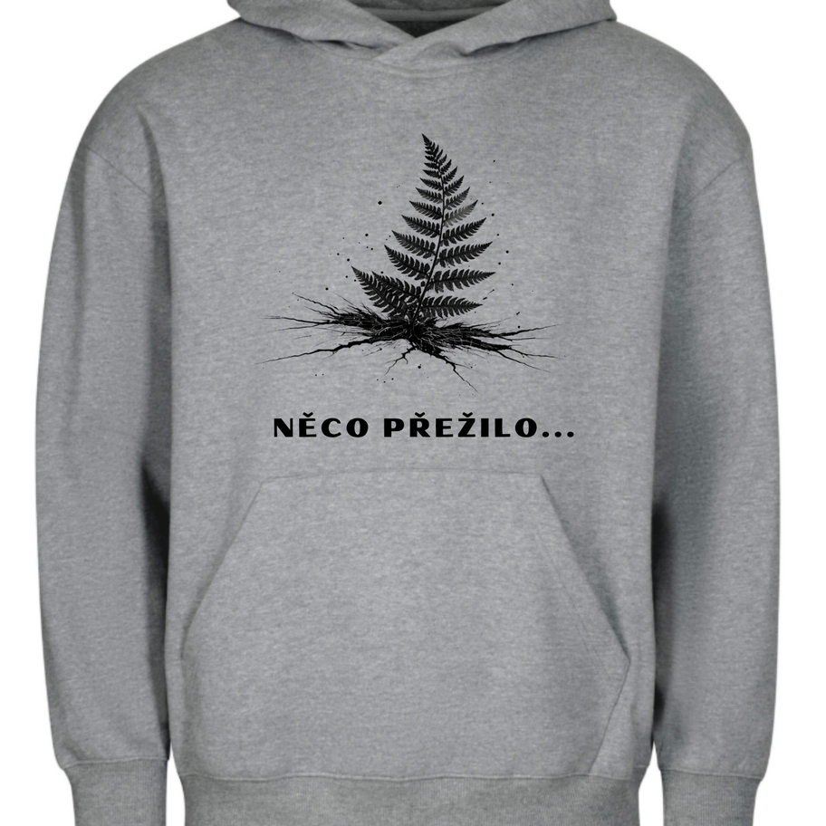 Výrazná grafika kapradiny prorůstající prasklinou symbolizuje život, který se nevzdal ani po pádu světa. Pohodlný střih, decentní detaily a silná myšlenka pro ty, kteří věří, že i po konci může něco zůstat.