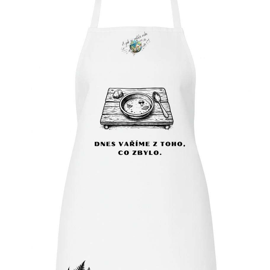 Minimalistický humor z konce světa. Zástěra inspirovaná románem A pak se zřítilo nebe připomíná realitu, kdy fantazie nahrazuje recepty a zbytky jsou hlavní surovinou. Pro kuchaře, kteří si poradí za každých okolností.